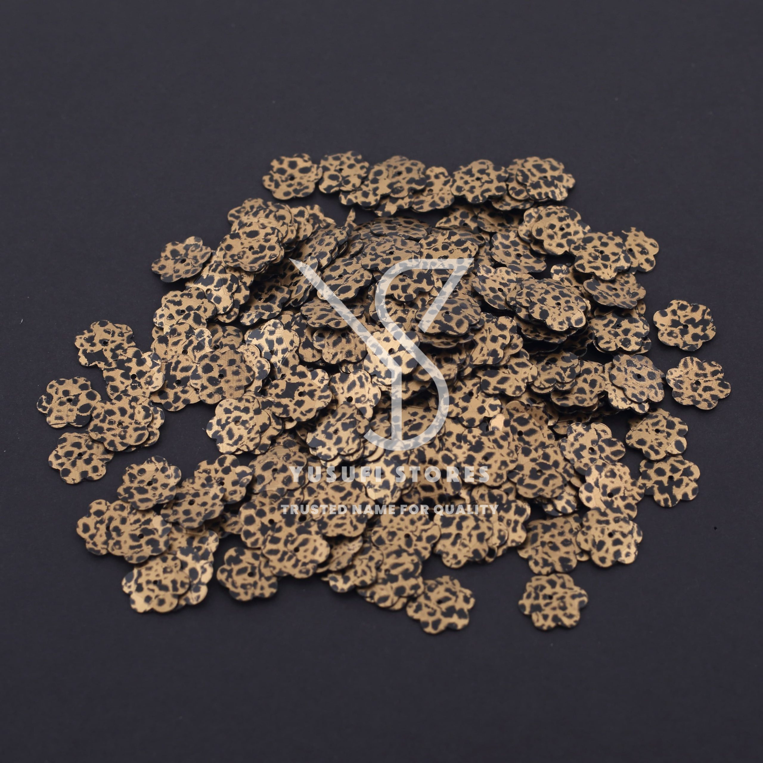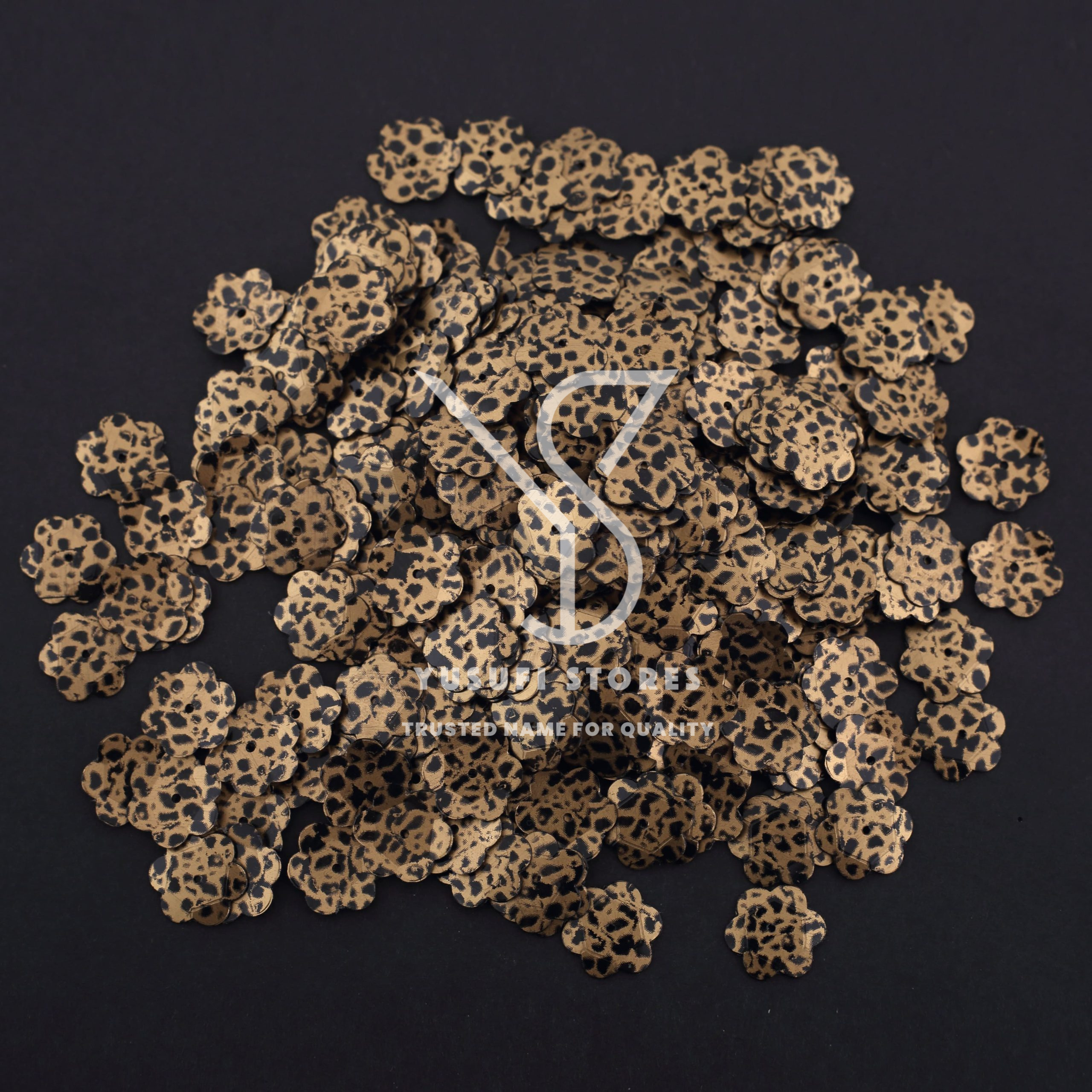 Tags: animal print flower sequins, animal print flower shape sequins, Animal Print Sequins, black animal spots on golden sequins, black spotted animal print sequins, fancy animal print sequins, flower animal print sequins, flower golden and black animal print sequins, flower sequins, flower shape sequins, flower shaped sequin, golden and black flower sequins, golden and black spotted animal print sequins, golden flower sequins, golden sequins, golden with black animal print sequins